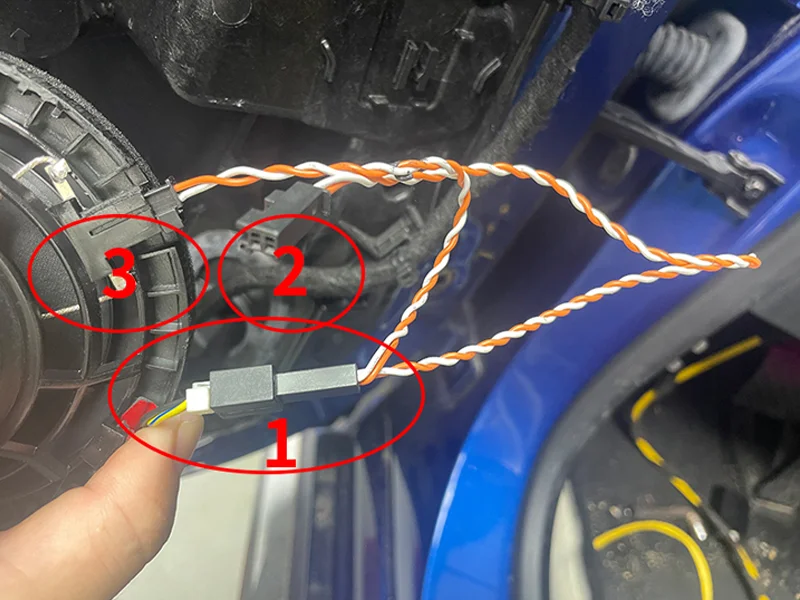 Connect red-circle-one to the original speaker wire, red-circle-two to tweeter, red-circle-three to midrange speaker